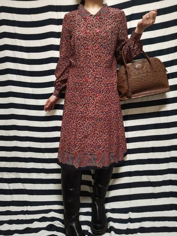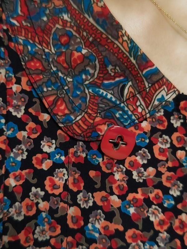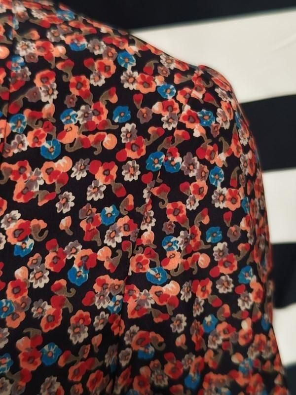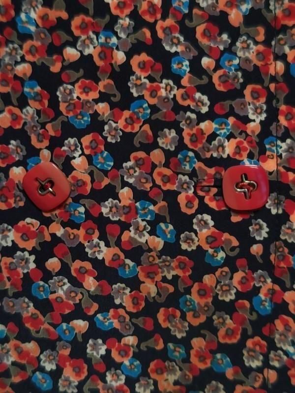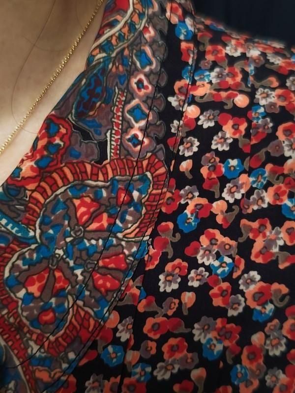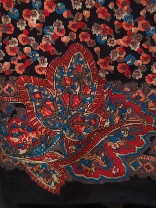 黒ベースに赤・オレンジ・ブルー系の小花柄がレトロで