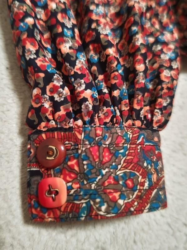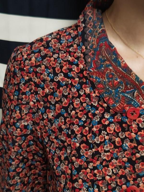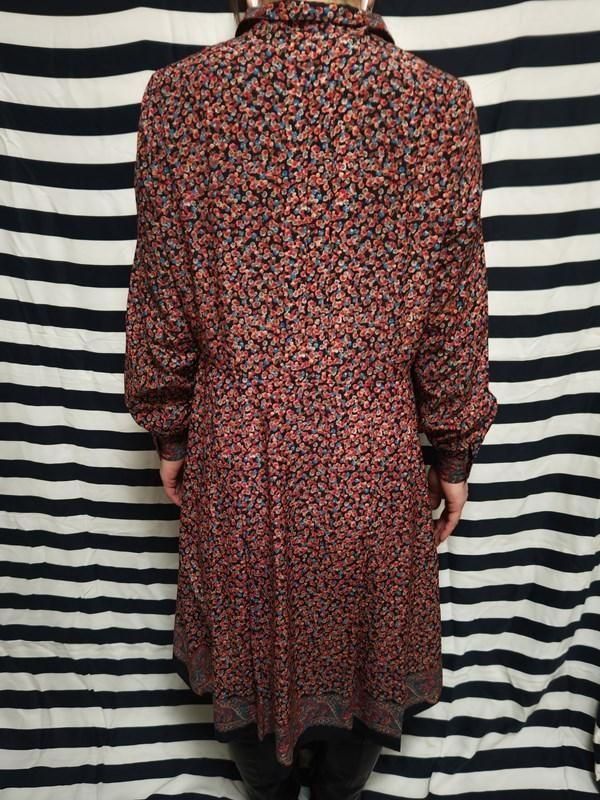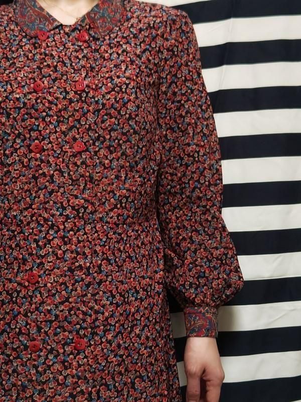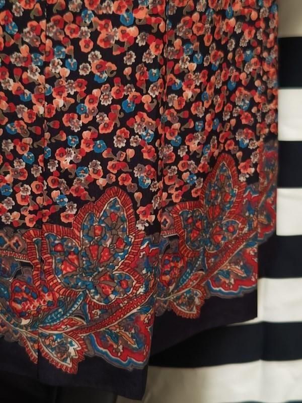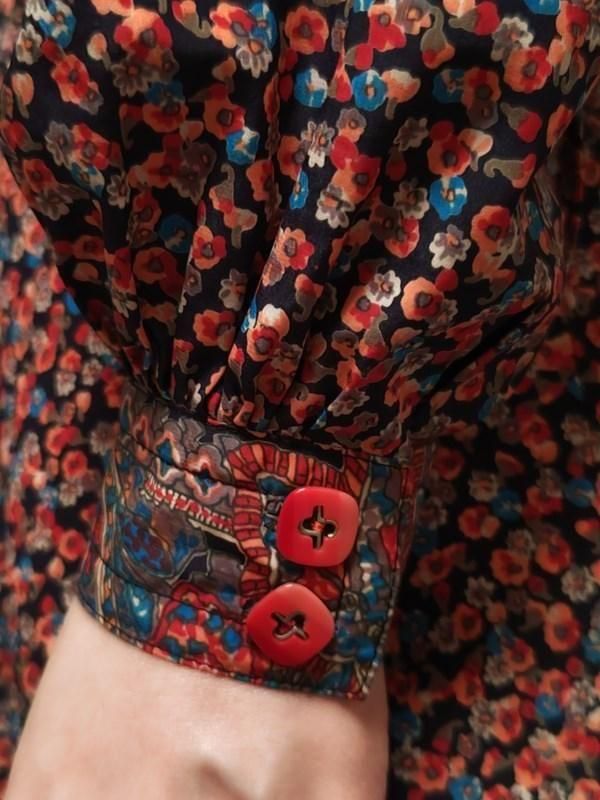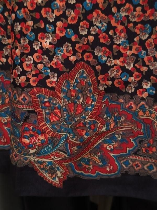 黒ベースに赤・オレンジ・ブルー系の小花柄がレトロで
