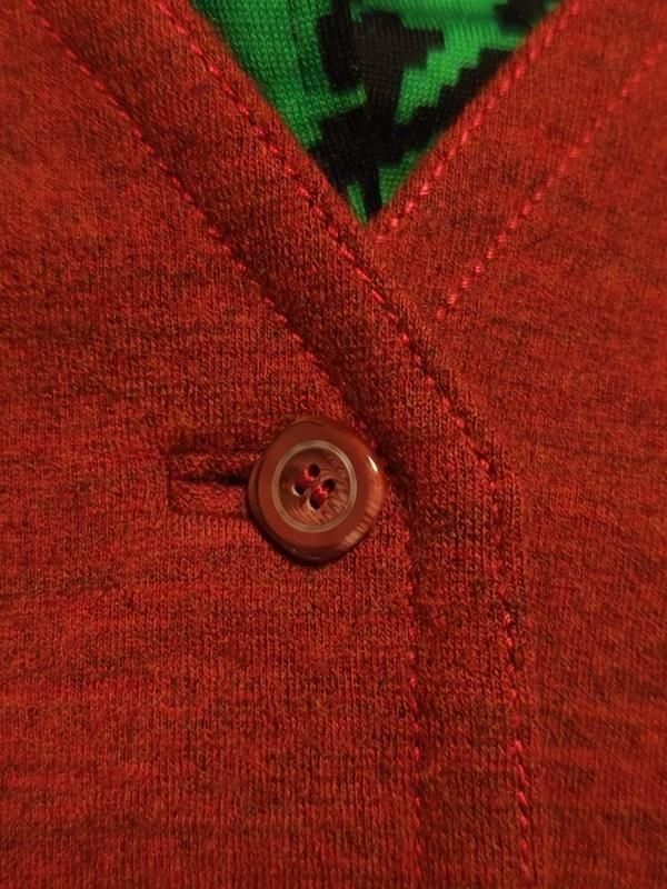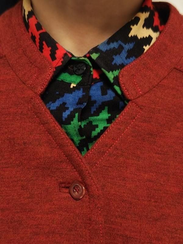 襟ぐりや裾の個性的カット、レトロボタンもポイント。